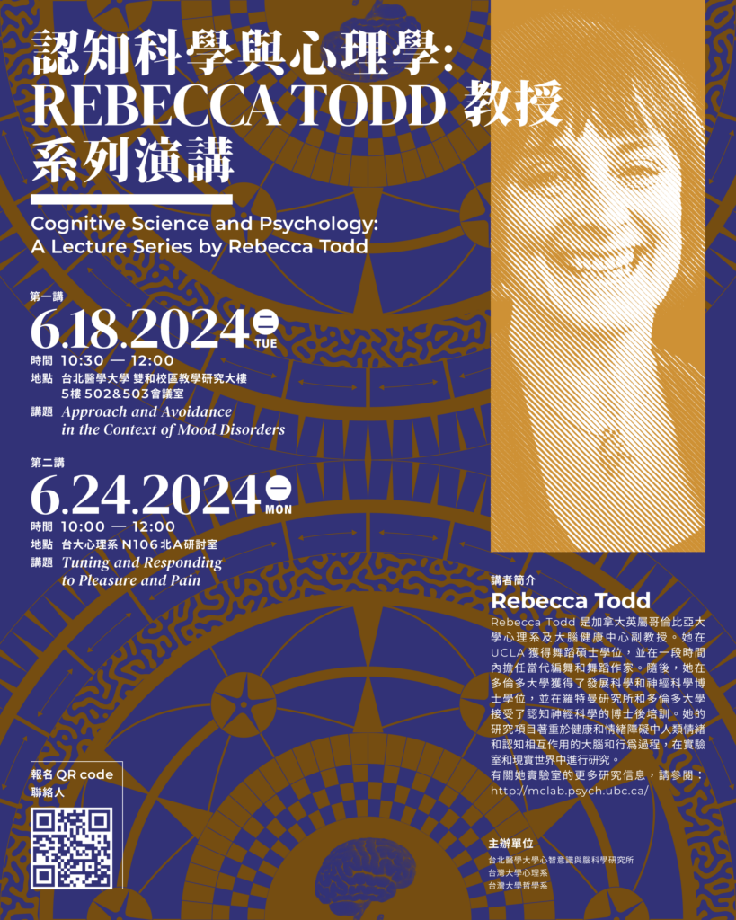 Time: 2024/06/18 (Tue) 10:30-12:00 Location: 502&503 Meeting room, Research and Teaching Building, SH Campus, Taipei Medical University Speaker: Dr. Rebecca Todd (Associate Professor, UBC Department of Psychology and Centre for Brain Health, Canada)