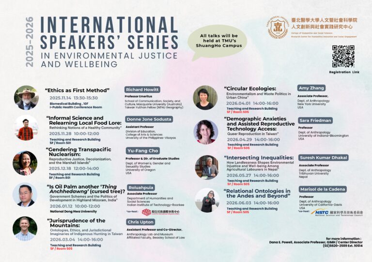 臺北醫學大學 人文暨社會科學院 人文創新與社會參與中心正在舉辦一場為期一年的「環境正義與福祉」國際講者系列講座,旨在突顯平等、生態和健康之間的交集。